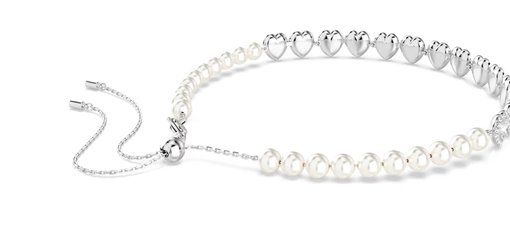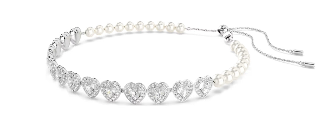This radiant choker was made for an intense expression of love. The rhodium plated design is partly decorated with luxurious Swarovski Crystal Pearls, while at the front, there is a row of heart-shaped crystals, each surrounded by a glittering halo of clear pavé. A sliding closure at the back means you can adjust the jewelry to your perfect fit. Pair this bold necklace with other matching jewelry to create your own romantic combinations.