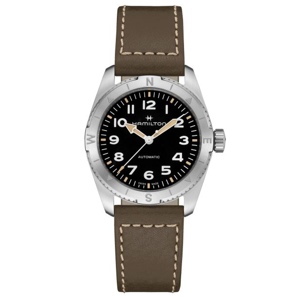 Gear up for the great outdoors with the Hamilton Khaki Field Expedition, an all-terrain adventure watch with a compass design enabling you to navigate your adventure with the help of the sun. Housed in a 37mm stainless steel case paired with a green leather strap, it is equipped with a screw-down crown to protect the movement no matter the weather. Featuring a black textured dial with Super-LumiNova® coating for ultimate legibility, the Khaki Field Expedition is tough when you need it.