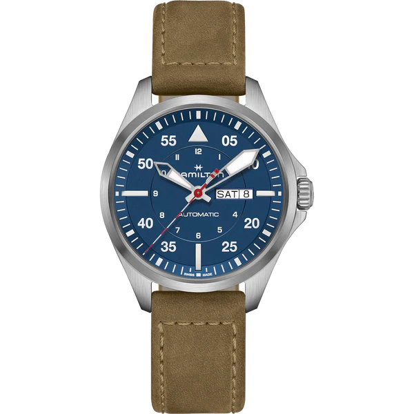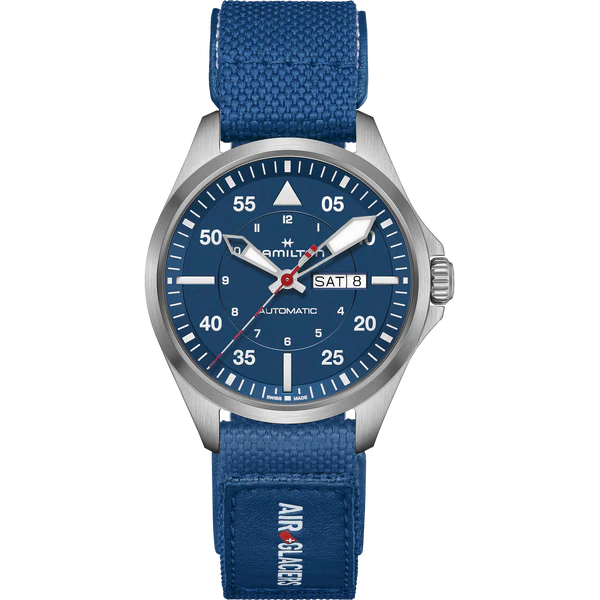 Dedicated to a unique partnership with the couragious Air-Glaciers, this special edition Khaki Aviation Pilot marks a collaboration like no other. Featuring a blue dial and a hypoallergenic, lightweight titanium 42mm case, it's a timepiece that's both durable and easily wearable. Pairing our signature H-30 automatic movement, 80-hour power reserve and a nylon outer, leather lined Velcro strap for maximum customization, this is a timepiece that's always ready for action.