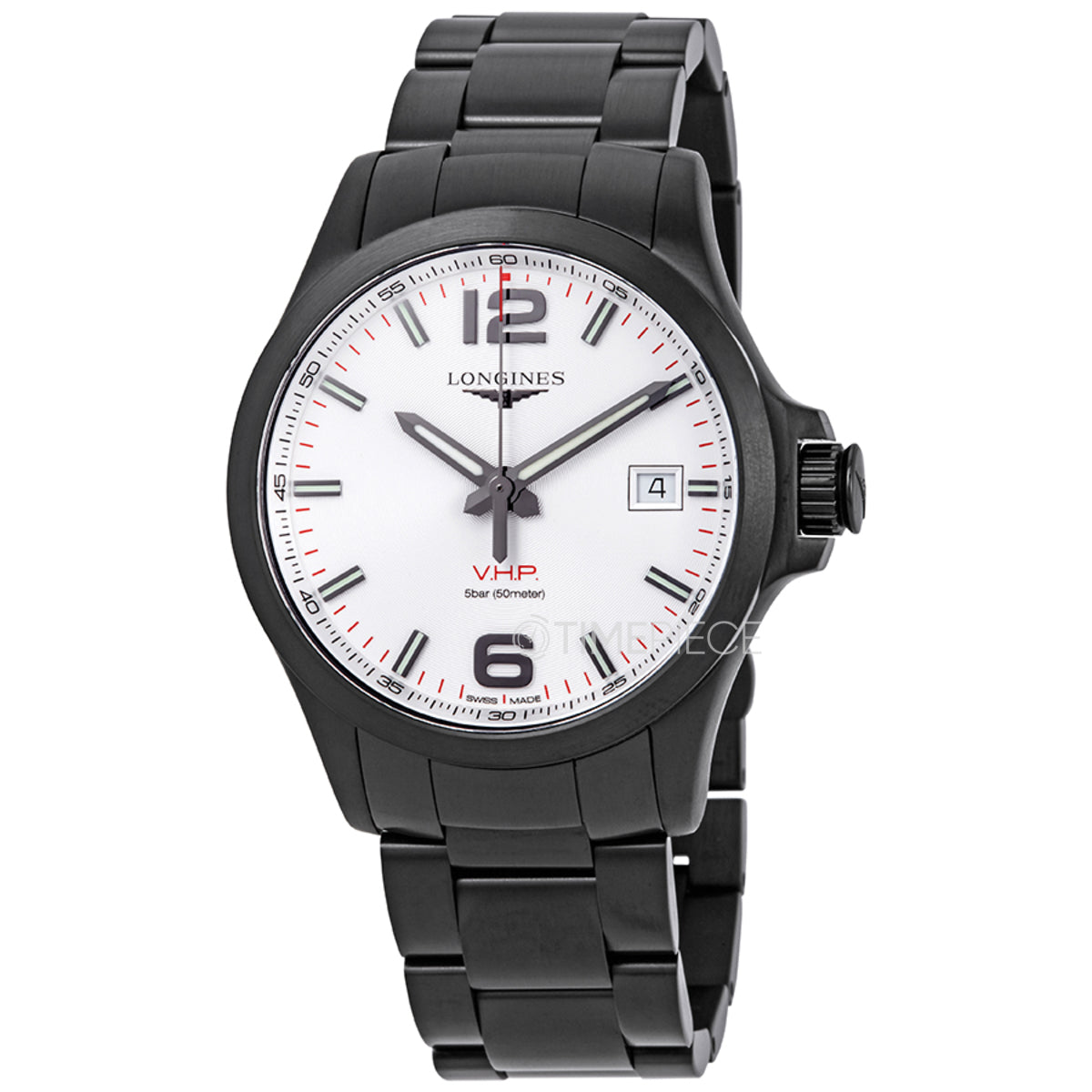 Black PVD stainless steel case and bracelet. Fixed black PVD bezel. Silver dial with luminous black hands and index hour markers. Arabic numerals appear at the 6 and 12 o'clock positions. Arabic numeral minute markers (at 5 minute intervals). Minute markers around the outer rim. Dial Type: Analog. Luminescent hands and markers. Date display at the 3 o'clock position. Longines calibre L288 quartz movement. Scratch resistant sapphire crystal. Solid case back. Round case shape. Case size: 43 mm. Bracelet width: 22 mm. Fold over clasp with a safety release. Water resistant at 50 meters / 165 feet. Functions: date, hour, minute, second. Conquest V.H.P. Series. Casual watch style. Watch label: Swiss Made. Longines Conquest V.H.P. Silver Dial Mens Watch L37262766.