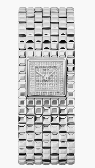 Inspired by the iconic model launched in 2002, Frederique Constant reinterprets the Classics Manchette in 2025, presenting a 25.7 x 20mm timepiece with an elegant and contemporary design. Its bold character is reflected in every detail, particularly in its seven-link stainless steel bracelet, featuring a Clou de Paris shape. This version features a stunning diamond pavé square-shaped dial set with 158 diamonds (0.23 carat) with silver tone hours and minutes. Powered by the FC-200 quartz movement, the Classics Manchette appeals to the woman seeking a watch with a unique presence, capable of enhancing any wrist with character, style, and distinction.