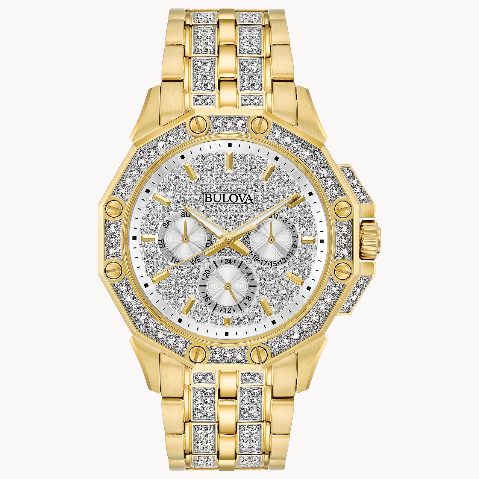 From the Men's Crystal Collection. Gold-tone stainless steel case embellished with 308 crystals on bezel, bracelet and pave dial, multifunction movement, gold-tone stainless bracelet with deployment closure, and water resistance to 30 meters.