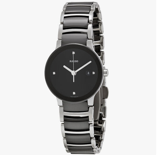Diamonds mark the 3, 6, 9 and 12 o'clock positions.The Rado name appears below the 12 o'clock positionBezel