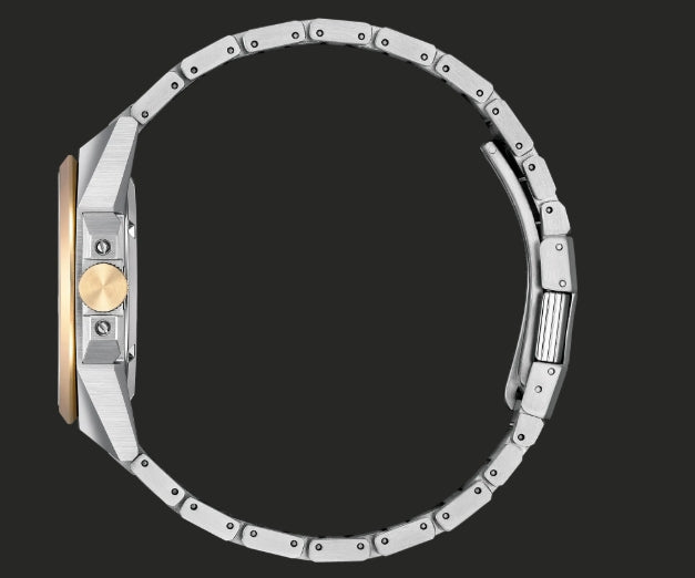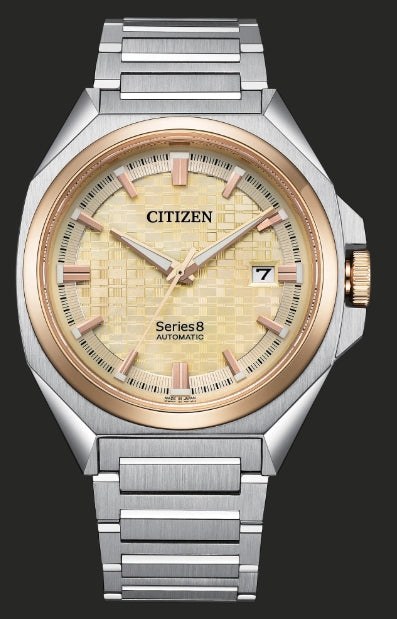 Representing the embodiment of thoughtful design and an ultra-clean execution, the new Series8 831 features a 40mm two-tone, faceted stainless steel case alongside the best of Citizen's brushed and polished finishing techniques. Water resistant to 100m and able to withstand magnetic fields up to 16,000 A/m, the watch is powered by the high-performance Caliber 9051. The automatic movement is visible through a sapphire exhibition case back and is capable of maintaining an accuracy of +20 / -10 seconds per day with a frequency of 28,800 v/h. As a whole, the timepiece's superior technical performance perfectly supports its elevated style.