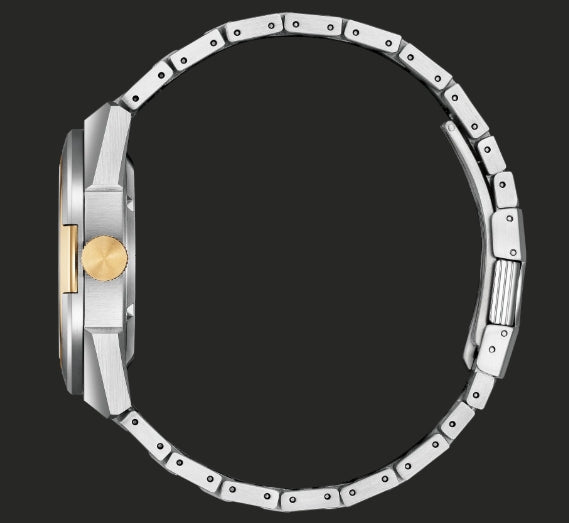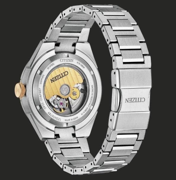 Powerful. Distinct. Refined. The new Series8 870 is ready for any occasion, featuring a 40.8mm two-tone, faceted stainless steel case alongside the best of Citizen's brushed and polished finishing techniques. Water resistant to 100m and able to withstand magnetic fields up to 16,000 A/m, the watch is powered by the high-performance Caliber 0950. The automatic movement is visible through a sapphire exhibition case back and is capable of maintaining an accuracy of -5 / +10 seconds per day with a frequency of 28,800 v/h and a power reserve of 50 hours. Together, the timepiece's superior technical performance readily supports its elevated style.