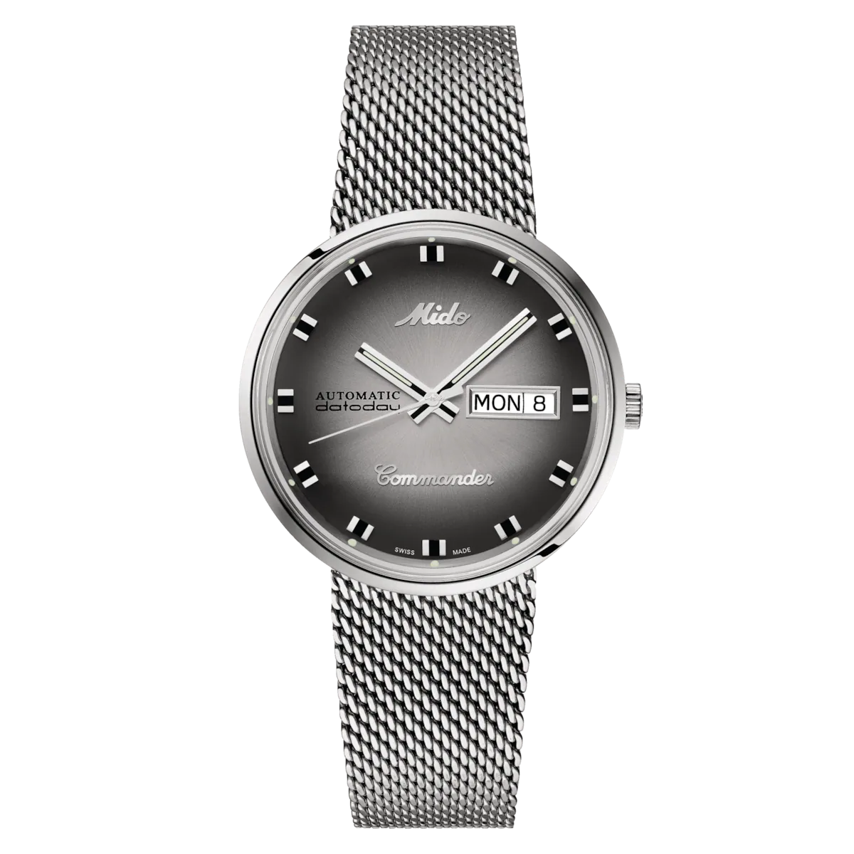 The Commander 1959 Swiss watch has been produced without interruption since that year. The integrated bracelet and the vintage Mido logo are typical of this iconic model as well as the monocoque case housing an automatic movement.